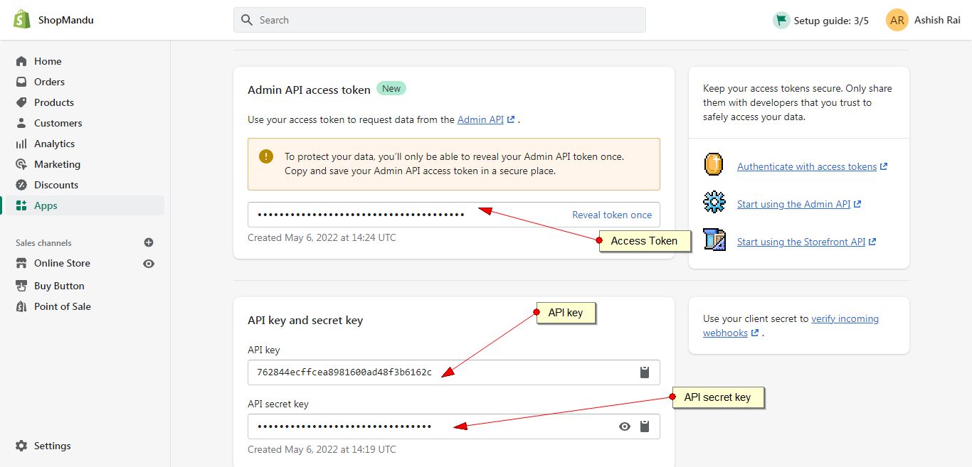 7 ) You will find access token under ‘Admin Access Token’. Click ‘Reveal token once’, copy the token and paste it in the ‘Shopify Access Token’ field.